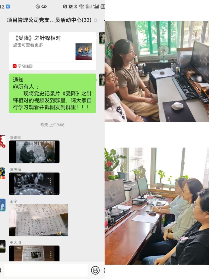 9月1日,項目管理公司黨支部開展“重溫歷史 奮勇爭先”主題活動?;顒又?,全體黨員干部共同觀看黨史紀錄片《受降》,紀錄片以詳實的史料、珍貴的影像生動展現(xiàn)中國共產(chǎn)黨始終以人民利益為根本,在復雜形勢下堅守信仰、運籌帷幄的政治智慧和使命擔當,引導黨員干部不斷加強黨史學習,切實把優(yōu)秀歷史經(jīng)驗轉化為推動工作的實際行動。
