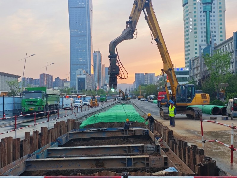 “追求精細(xì)極致,鑄就基坑支護(hù)的穩(wěn)固防線”。項(xiàng)目部將鋼板樁施打質(zhì)量視為確?;影踩c質(zhì)量的關(guān)鍵環(huán)節(jié),嚴(yán)格執(zhí)行材料準(zhǔn)入制度,所有進(jìn)場(chǎng)鋼板樁均經(jīng)過(guò)材質(zhì)證明核查、尺寸精度測(cè)量和外觀質(zhì)量檢驗(yàn)三重把關(guān),確保樁身無(wú)裂紋、無(wú)銹蝕等質(zhì)量缺陷,從源頭上杜絕不合格材料。施工中,施工人員采用全站儀進(jìn)行動(dòng)態(tài)監(jiān)測(cè),嚴(yán)格控制樁身垂直度偏差在規(guī)定范圍內(nèi),詳細(xì)記錄每根樁的打入深度、貫入度等關(guān)鍵參數(shù)。拔樁階段采用專(zhuān)用施工設(shè)備,按照“先支后拆、分段拔除”的原則有序進(jìn)行,拔樁后出現(xiàn)的孔隙立即灌砂,最大限度減少對(duì)周邊土體的擾動(dòng),實(shí)現(xiàn)平穩(wěn)施工與環(huán)境保護(hù)的和諧統(tǒng)一。